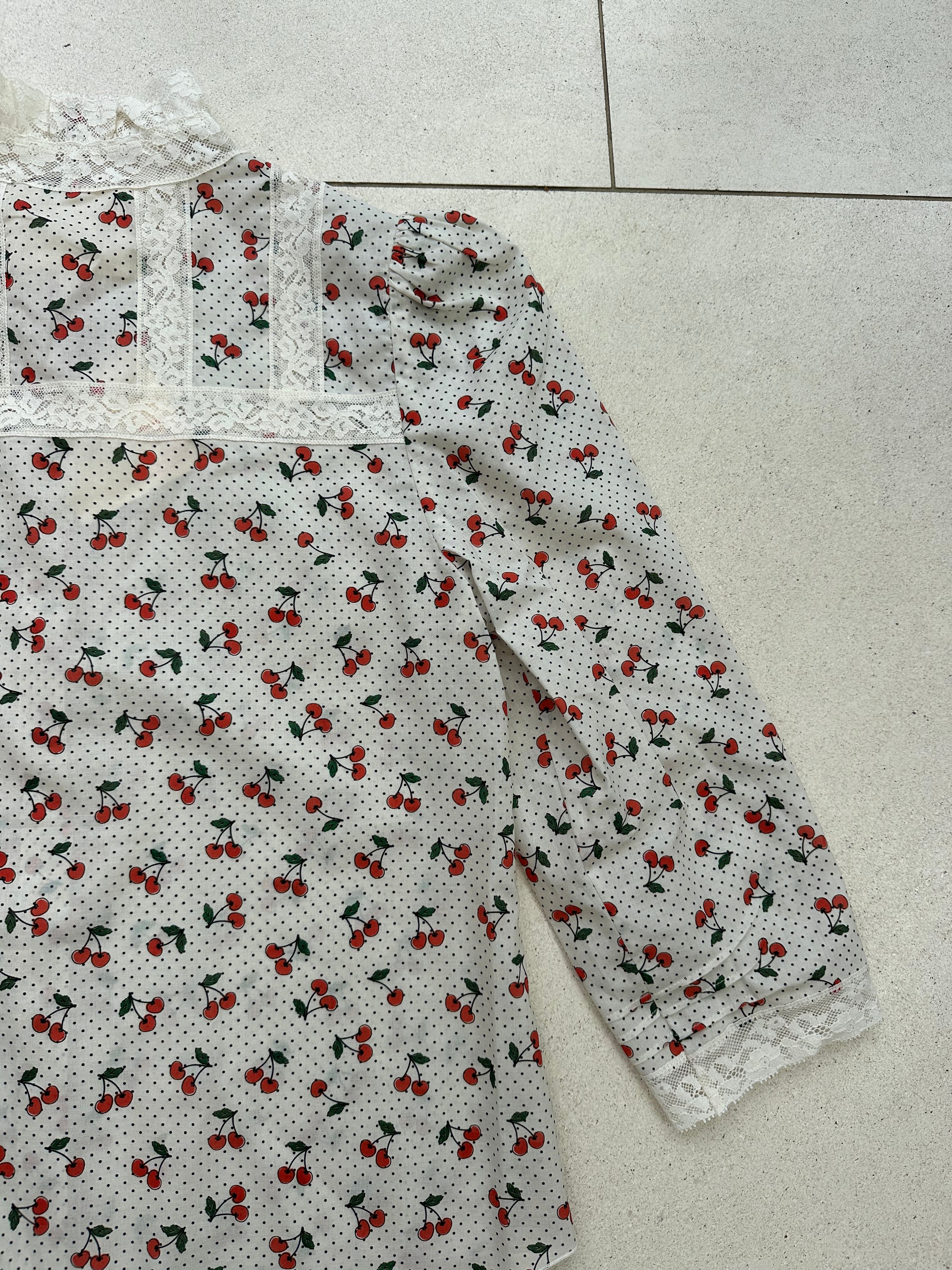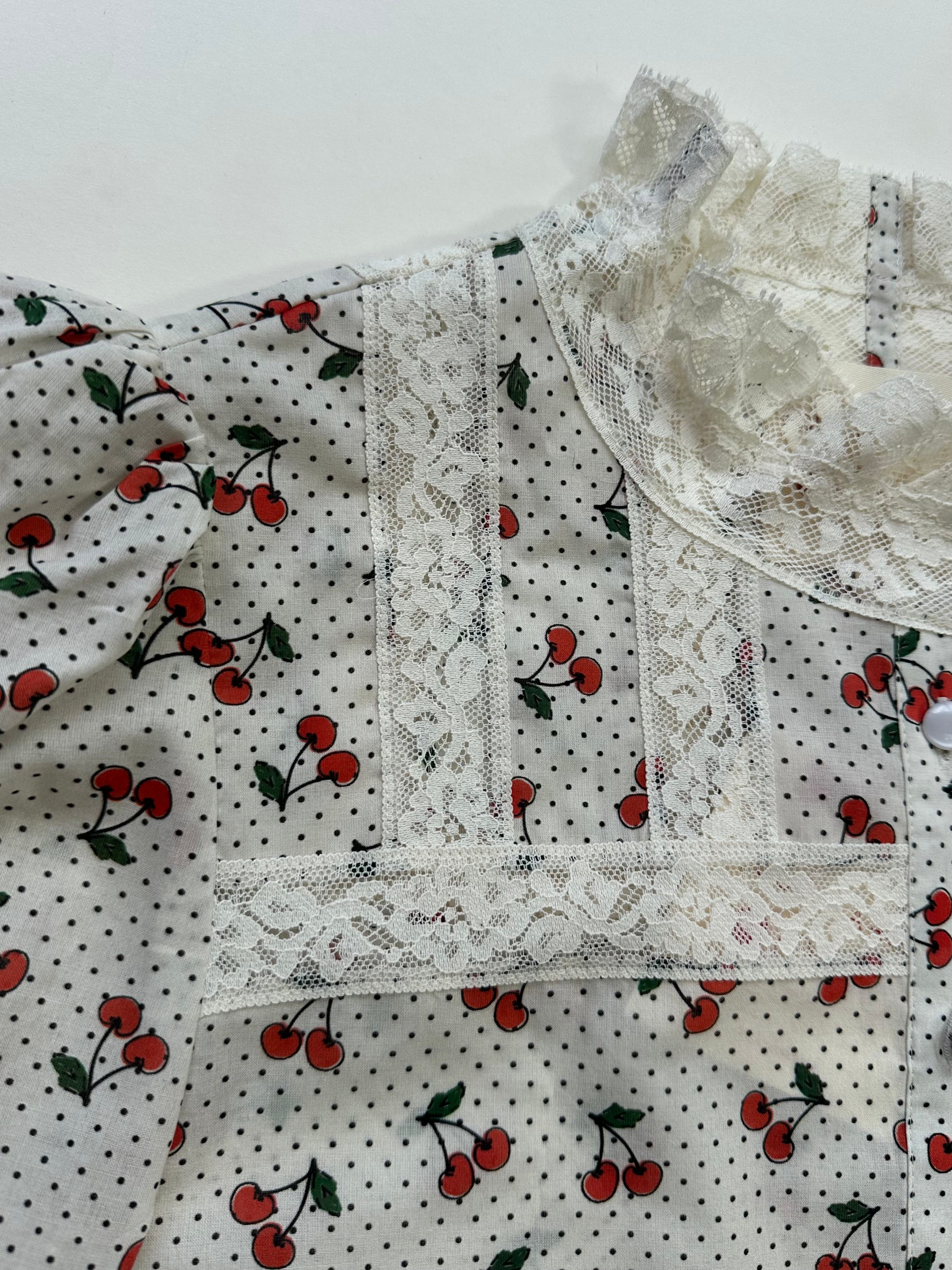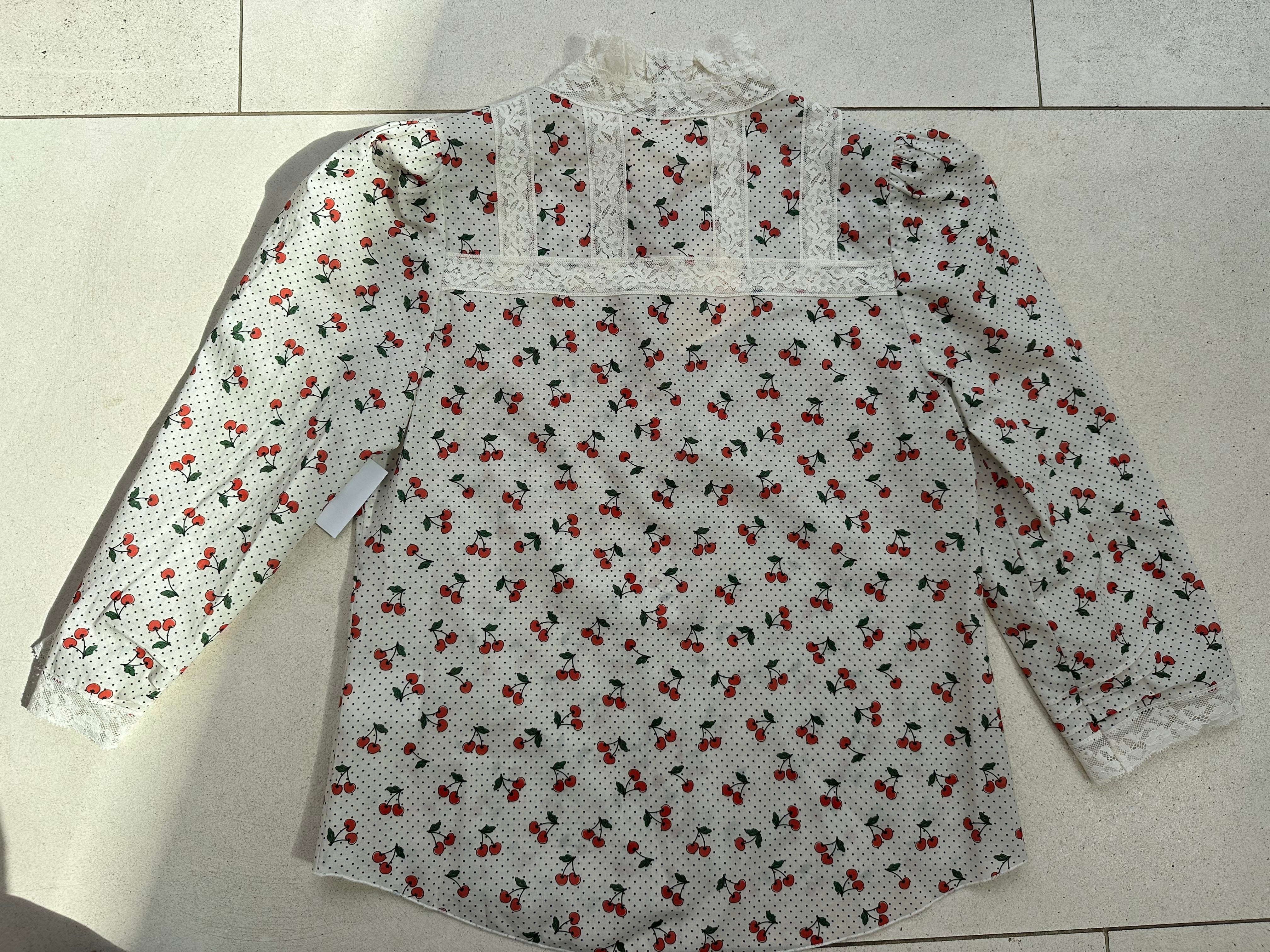 This beautiful blouse features our exclusive cherry print, vintage-inspired lace accents, mother of pearl buttons and soft puff sleeves, perfect for elevating your wardrobe with feminine charm.