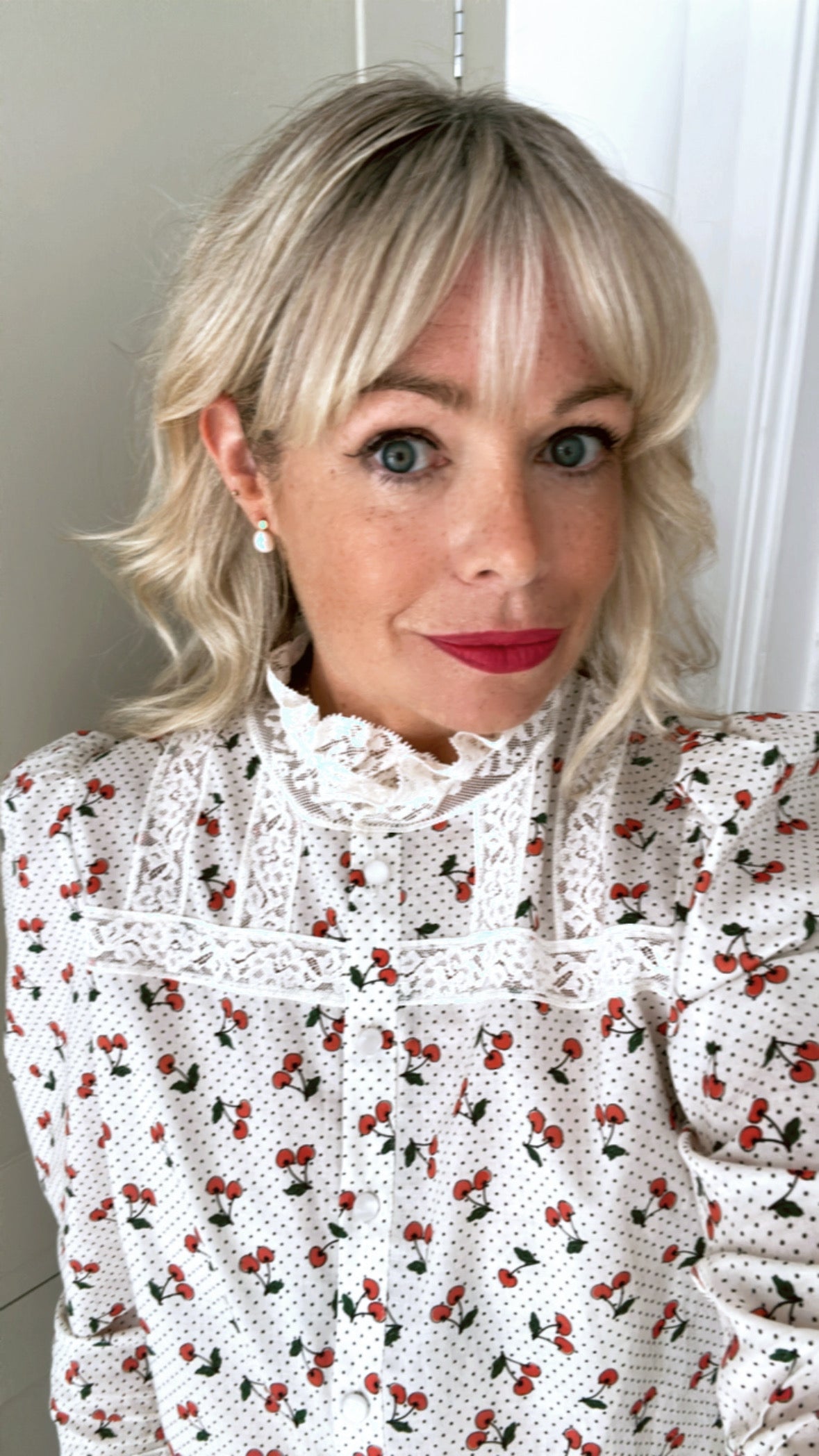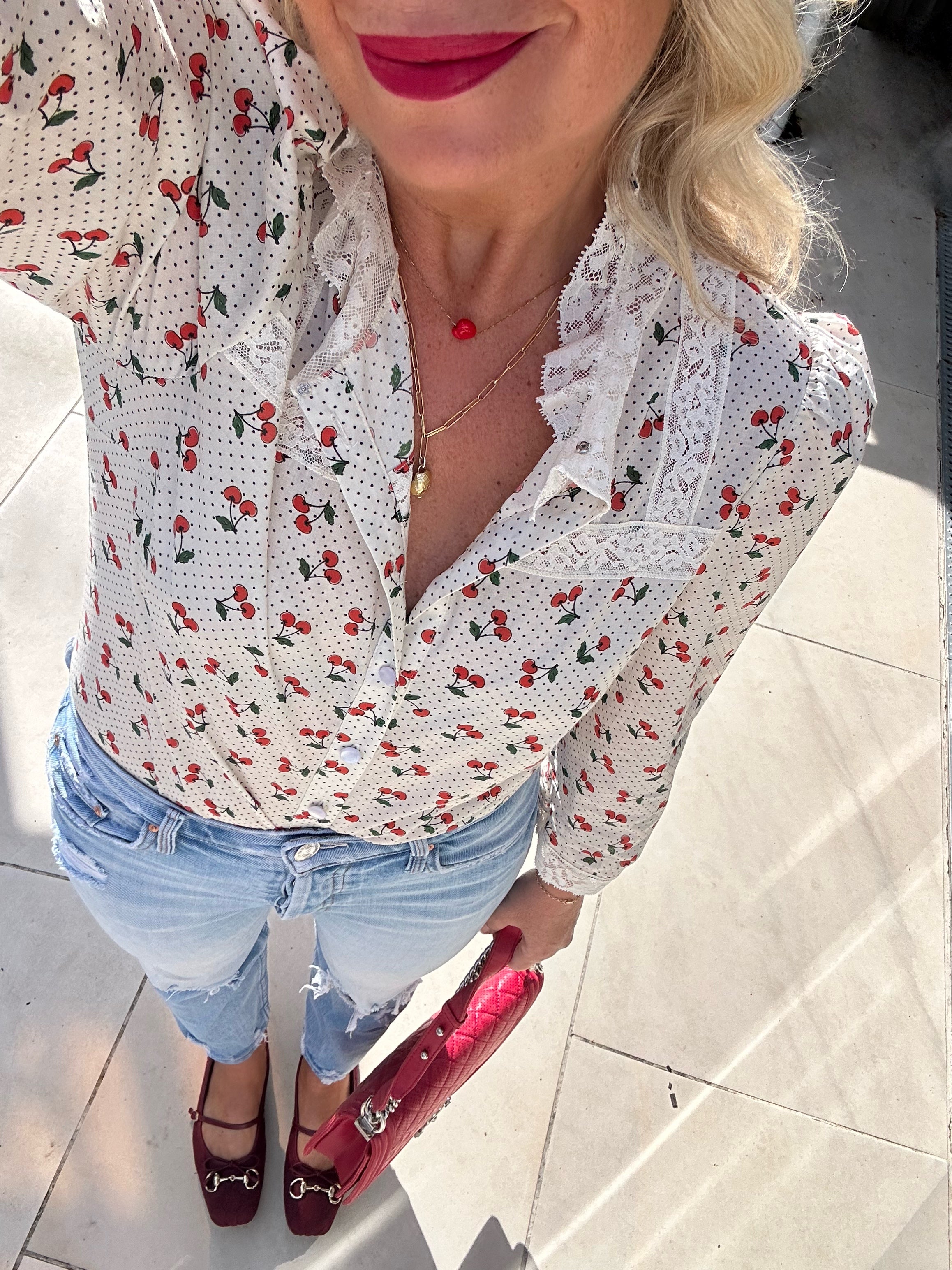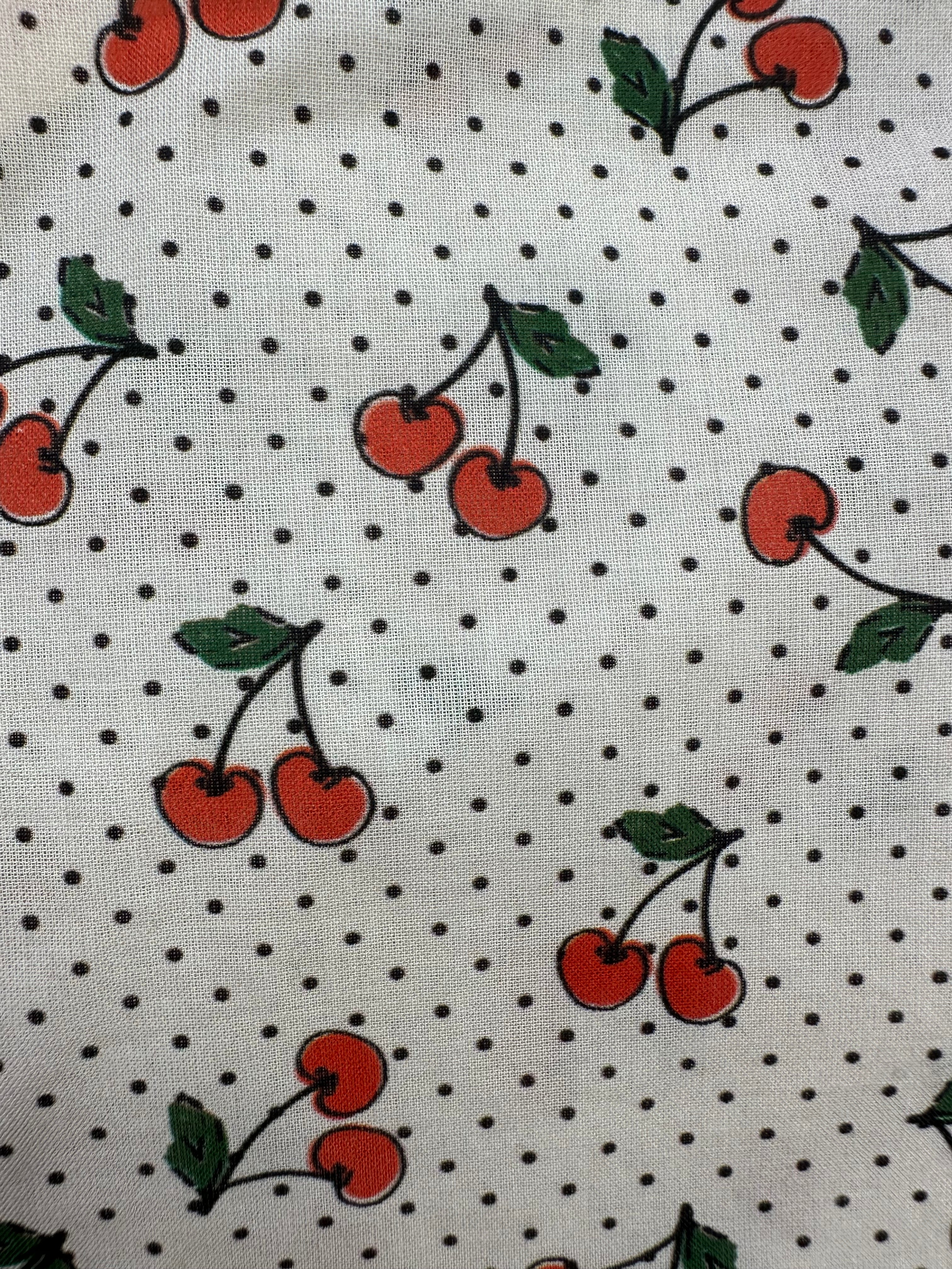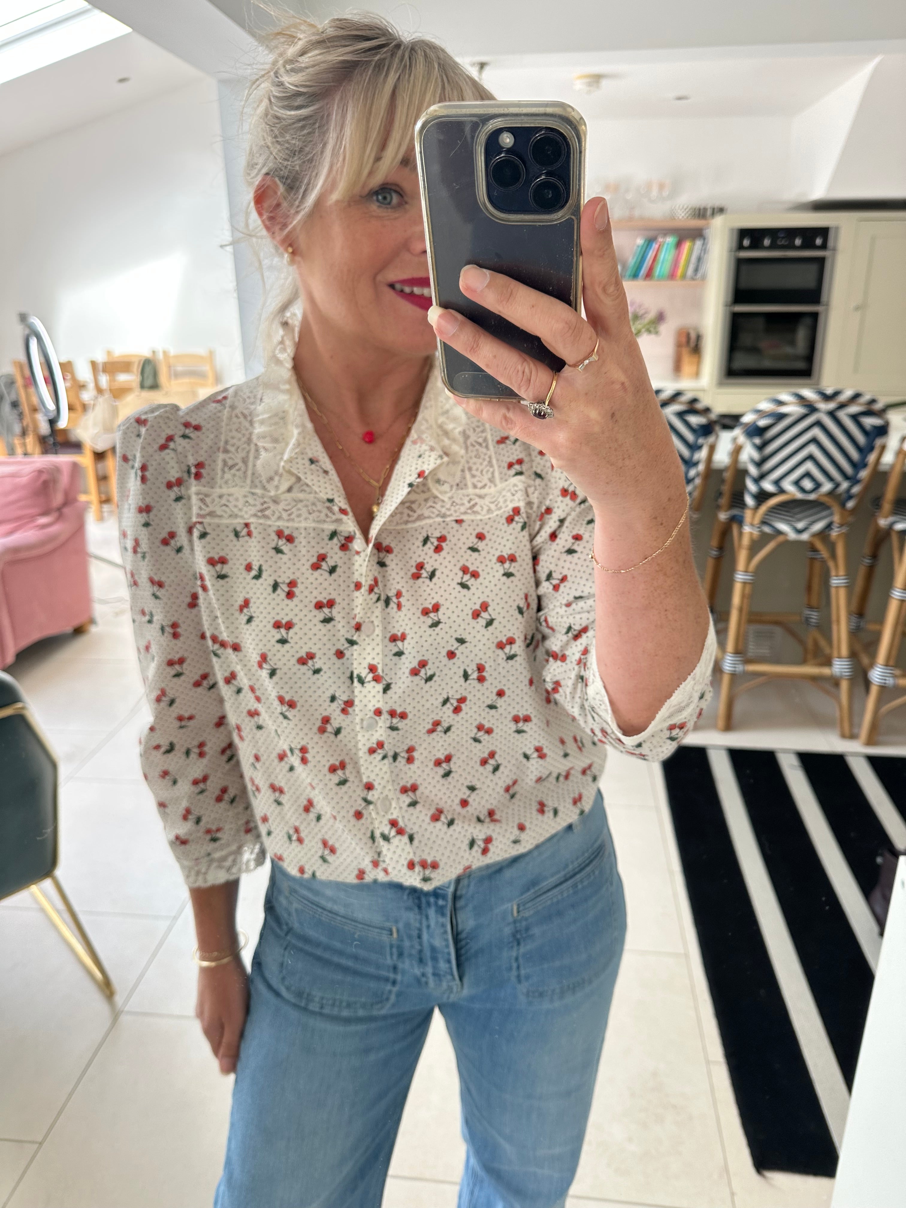 This beautiful blouse features our exclusive cherry print, vintage-inspired lace accents, mother of pearl buttons and soft puff sleeves, perfect for elevating your wardrobe with feminine charm.